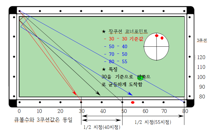 2) 30에서 출발하면 30으로 간다. 즉 기본값인데 목적구가 20으로 1포인트 앞쪽에 있으므로 장축에서는 동일하게 1포인트 내려서 큐볼을 보내면 득점에 유리합니다.