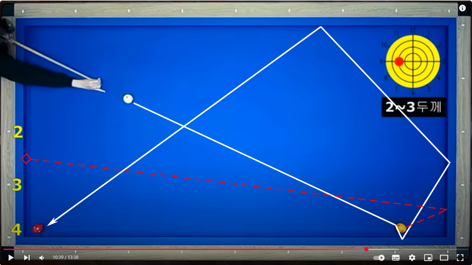 1목적구가 단쿠션과 1포인트 이상 2포인트 내에 배치되어 있을 경우 큐볼과 부딪힌 후 일자로 움직이는 두께보다 1포인트 더 진행합니다.