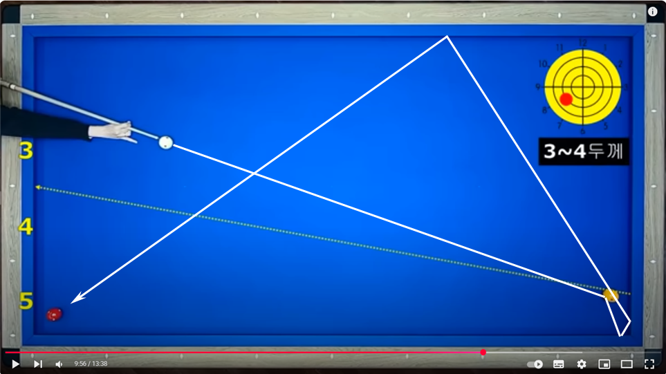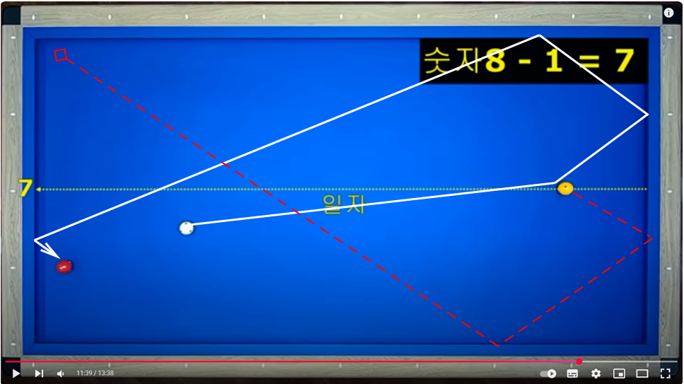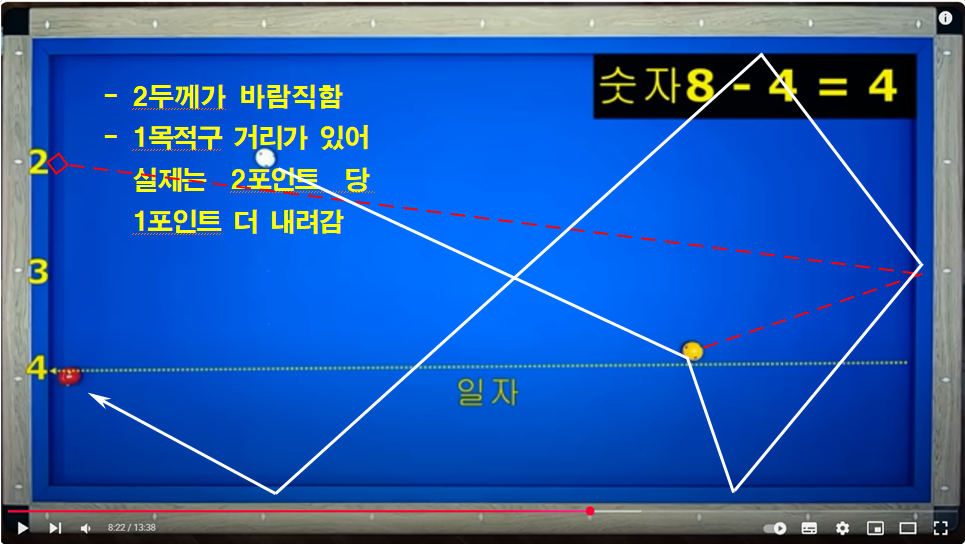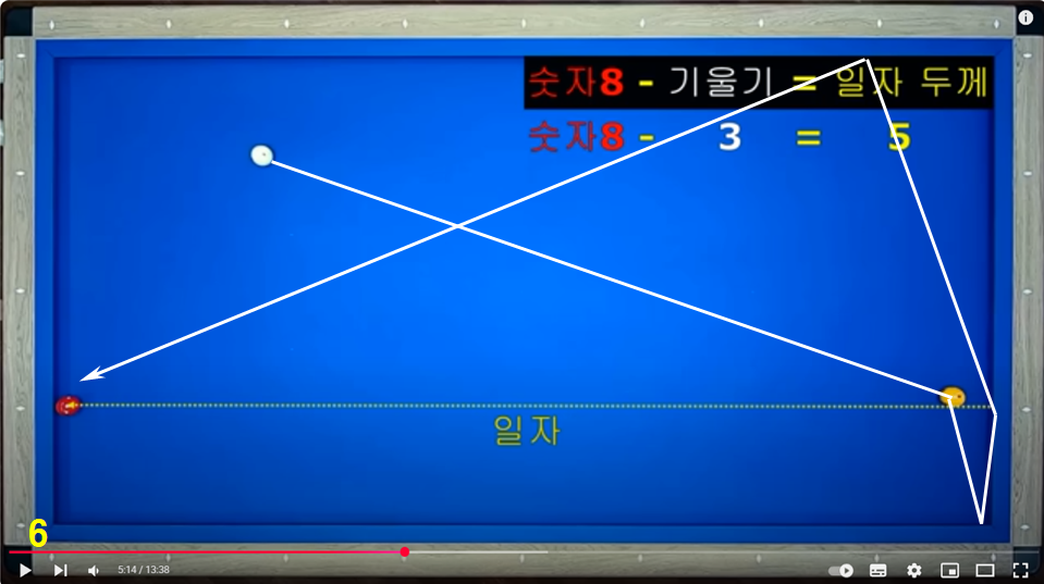 기울기가 3이므로 일자로 움지이는 두께는 (8-3 = 5)이다. 즉 큐볼을 1목적구로 5두께로 충돌하면 1목적구는 단쿠션과 부딪쳐 일자로(수직으로) 내려간다 이것이 일자로 움직이는 두께를 의미합니다