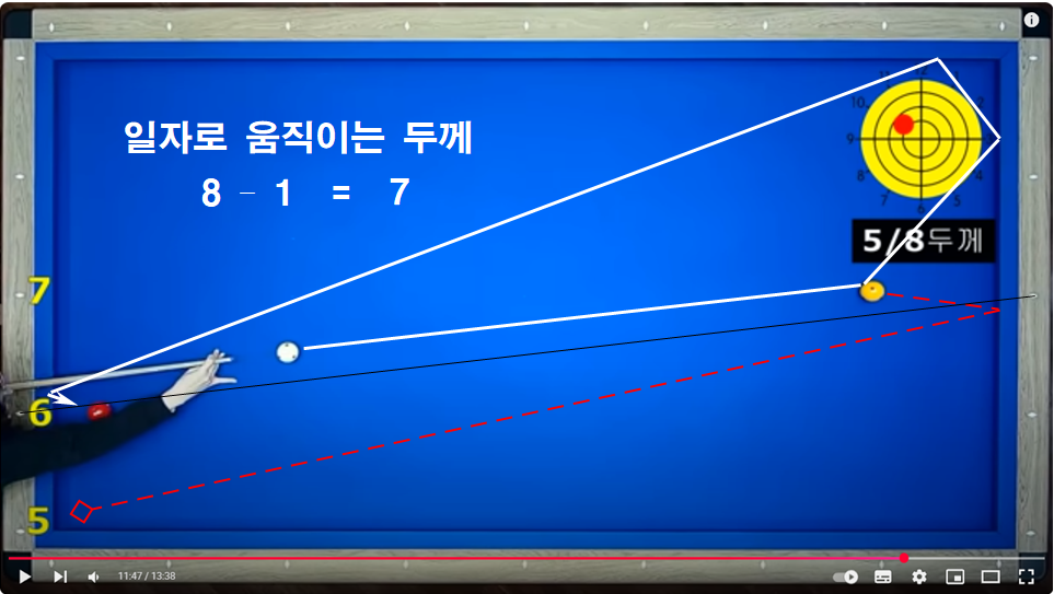 그리고 1목적구가 큐볼과 충동후 움직이는 팬턴 즉 일자로 움직이는 두께는 ""8 - 기울기 "" 입니다.
