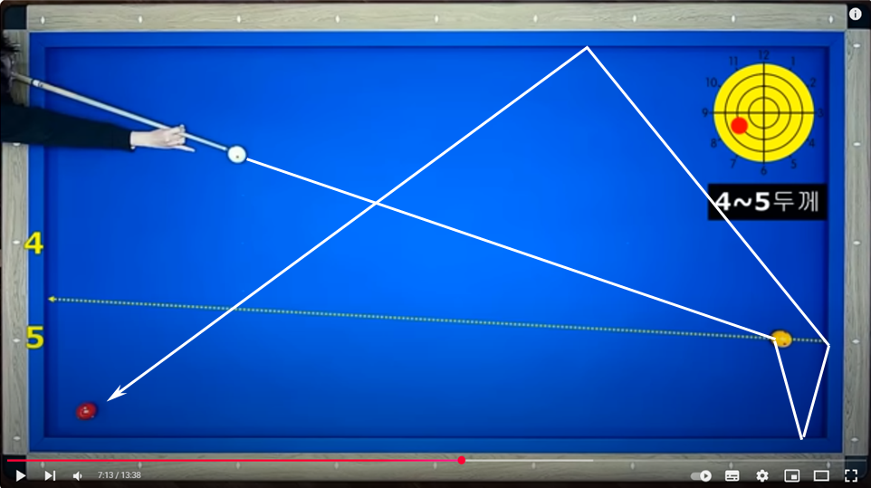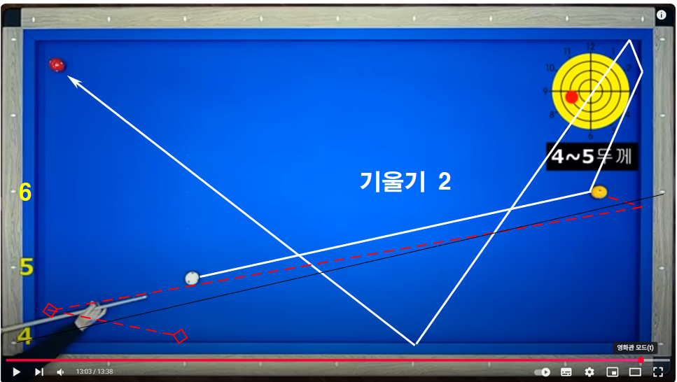 일자로 움지이는 두께가 5 인데 2목적구는 6두께 자리에 있으므로 4~5두께로 큐볼을 보내면 키스도 방지하고 득점도 가능합니다