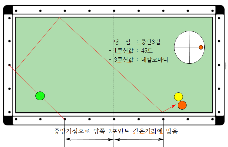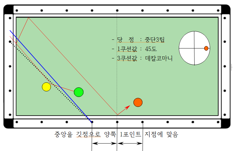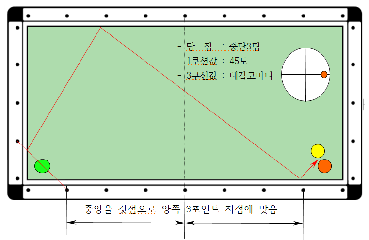 도면과 같이 라인을 출발하면 데칼코마니법칙에 따라 장쿠션 7포인트에 도착합니다. 즉 출발지점에서 중앙을 기점으로 양쪽으로 같은 지점인 3포인트 지점에 도착합니다.