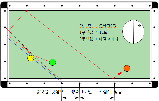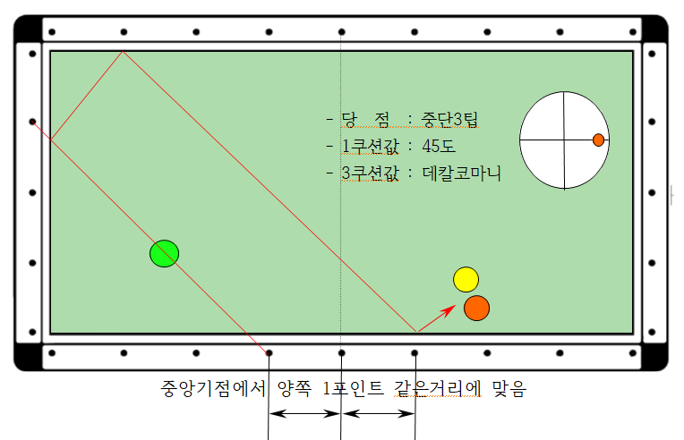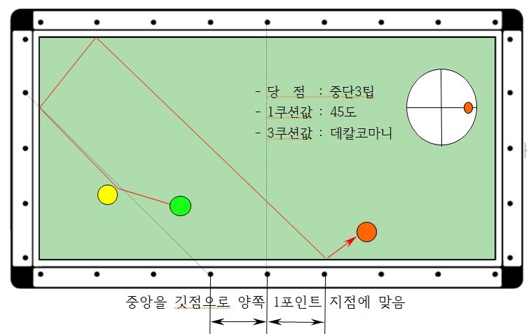 아. 따라서 당초대로 45도 각도로 보내고 대신 당점을 1회전을 줄여(중상단2팁) 큐볼을 보내면 3쿠션으로 2목적구를 맞출 수 있습니다