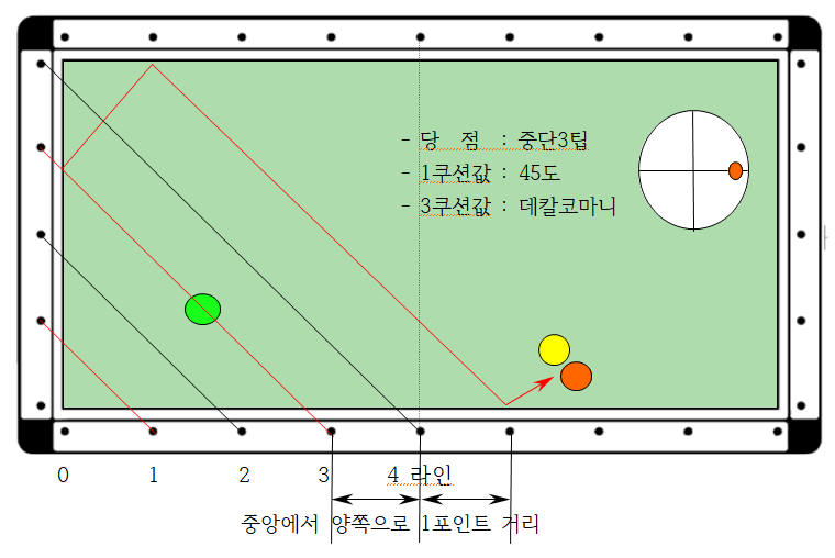 다. 2목적구는 데칼코마니법칙에 따라 5포인트로 보내면 되는데 1포인트 줄어든 4포인트 위치에 있습니다