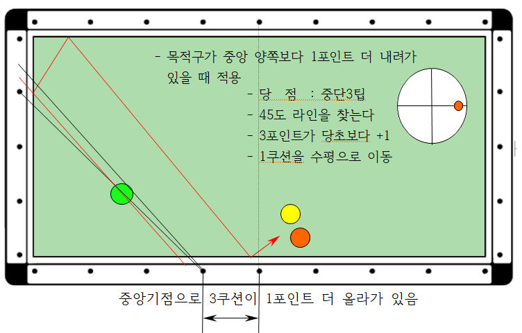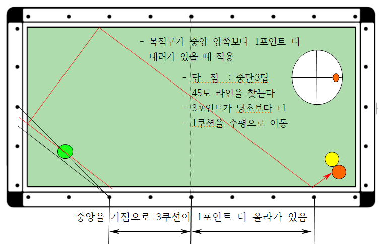 가. 도면과 같은 라인을 출발하면 데칼코마니법칙에 따라 장쿠션 5포인트에 도착합니다 그런데 현재 목적구가 1포인트 더 내려간 6포인트에 위치하고 있습니다.