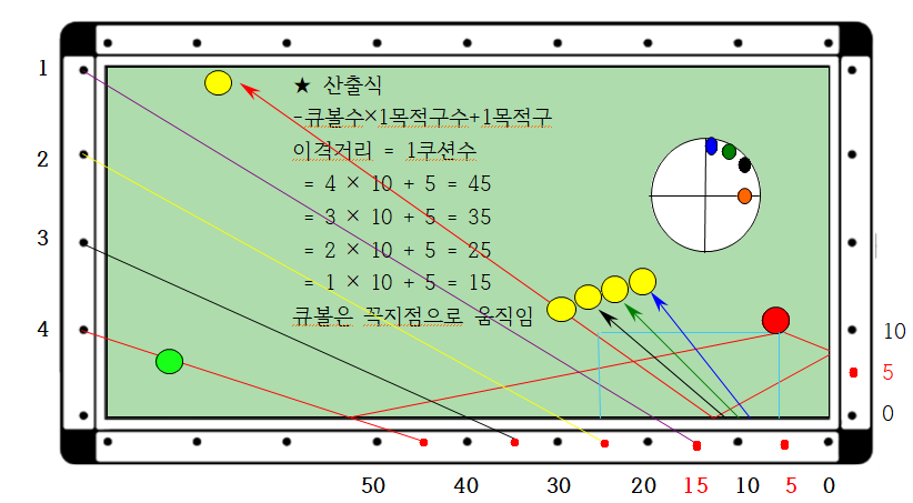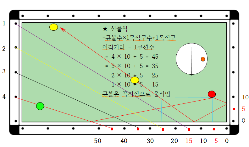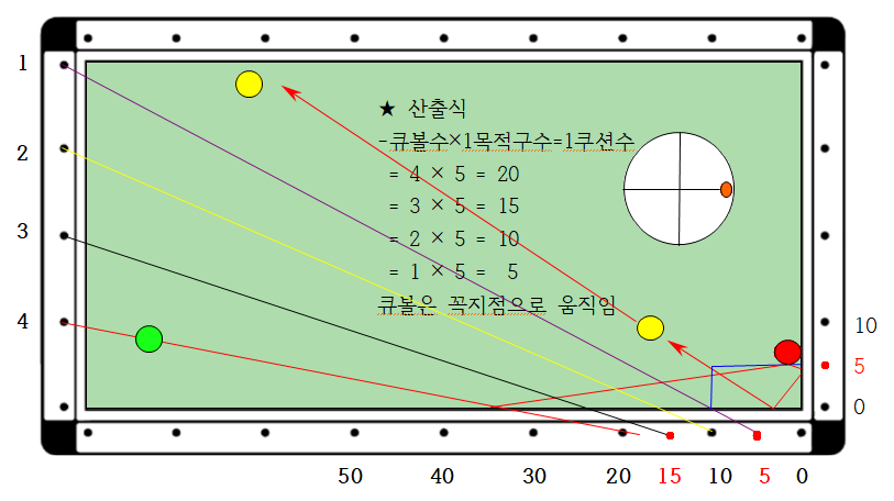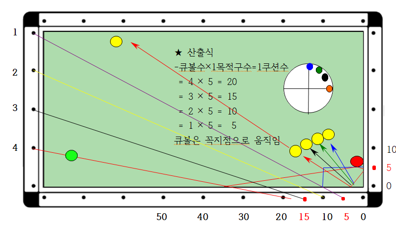 4. 1쿠선 지점은 = 큐볼수 × 1목적구수에 따라 4 × 5 = 20 이다. 따라서 역중단3팁으로 큐볼을 1쿠션 20지점으로 2레일 속도로 타격감 없는 롱팔로우로 큐대를 쭉 밀어주면 득점 할 수 있습니다.