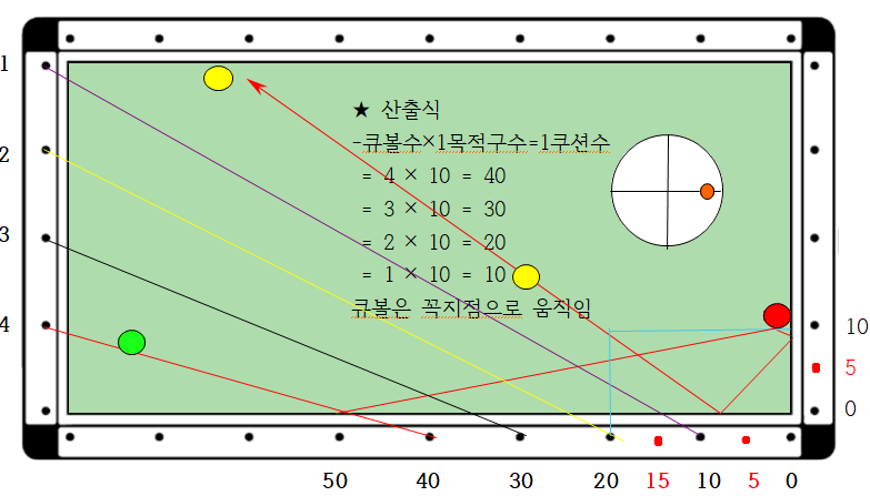 4. 1쿠선 지점은 = 큐볼수 × 1목적구수에 따라 4 × 10 = 40 입니다. 따라서 역중단3팁으로 큐볼을 1쿠션 40지점으로 2레일 속도로 타격감 없는 롱팔로우로 큐대를 쭉 밀어주면 득점 할 수 있습니다.