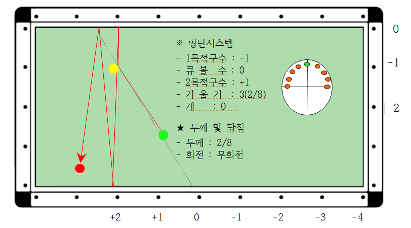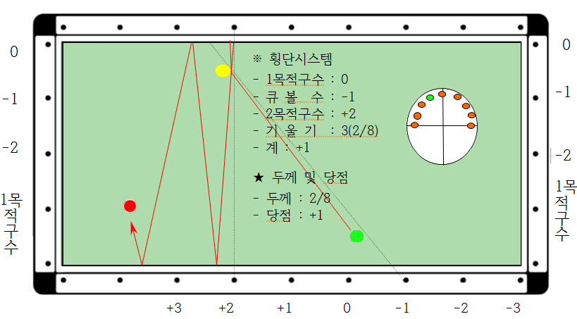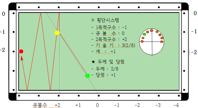 2. 큐볼수는 : 1목적구 축을 +2로 하고 1목적구 맞추는 옆면과 직각으로 연결한 점을 구한다.