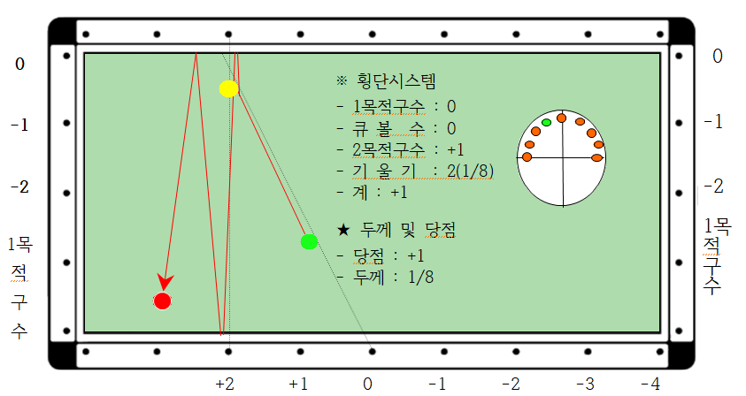 2. 1목적구수는 : 쿠션으로부터 직각으로 1포인트 이내인 경우 0팁, 1포인트 떨어진 경우 -1팁, 2포인트 떨어져 있으면 -2팁으로 합니다. 그 이상은 다른 시스템을 적용하는 것이 더 바람직합니다