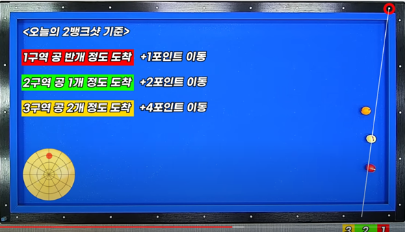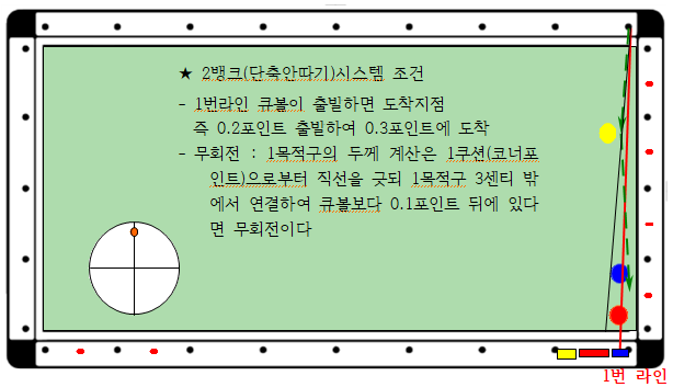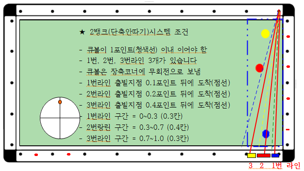 - 큐볼이 1포인트(청색선) 이내 있어야 하고 1번, 2번, 3번 3개의 라인이 있습니다