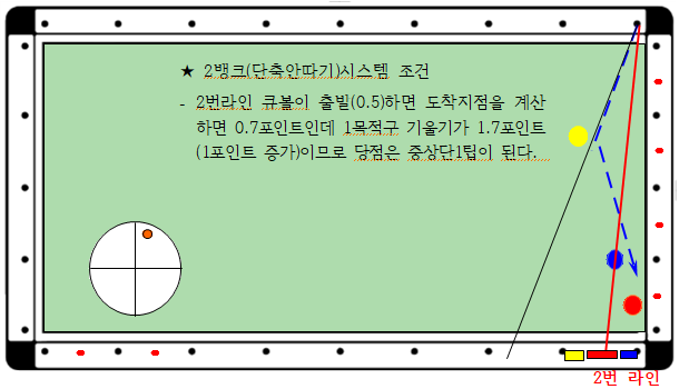 - 2번라인 출발지점보다 0.2포인트 뒤에 3쿠션으로 도착(점선), 0.3~0.7 (0.4칸)