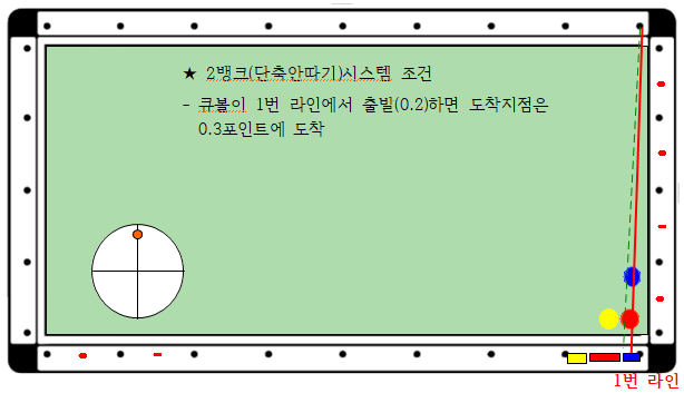 - 1번라인 출발지점보다 0.1포인트 뒤에 3쿠션으로 도착(점선), 0~0.3 (0.3칸)