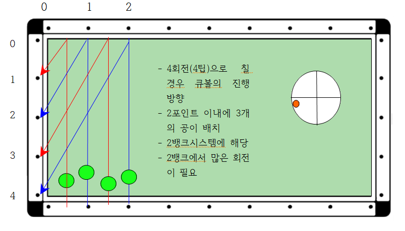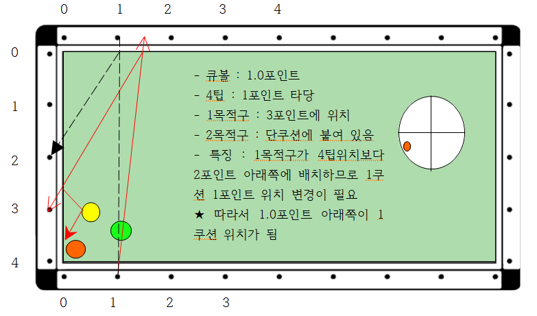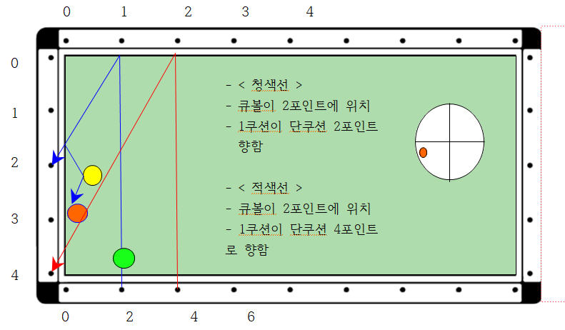 즉 큐볼의 수정이 장쿠션 0.5포인트 변동에 단쿠션 1포인가 변동되므로 여기서는 목적구가 위쪽에 있으므로 빨간선으로 큐볼을 1.0포인트 앞쪽으로 보냈을 경우(1.0포인트) 2쿠션으로 2포인트에 맞아 3쿠션으로 득점이 가능하다는 원리 입니다.