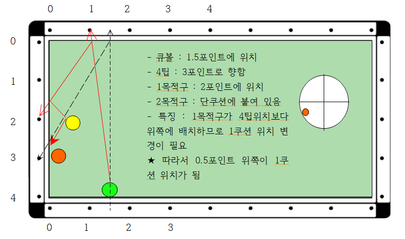 2. 검은점선에서 큐볼이 장쿠션 1.5포인트에 있으므로 4팁으로 보냈을 경우 단쿠션 1포인트로 간다는 원리인데 1목적구가 2포인트에 배치되어 있어 수정이 필요 합니다.