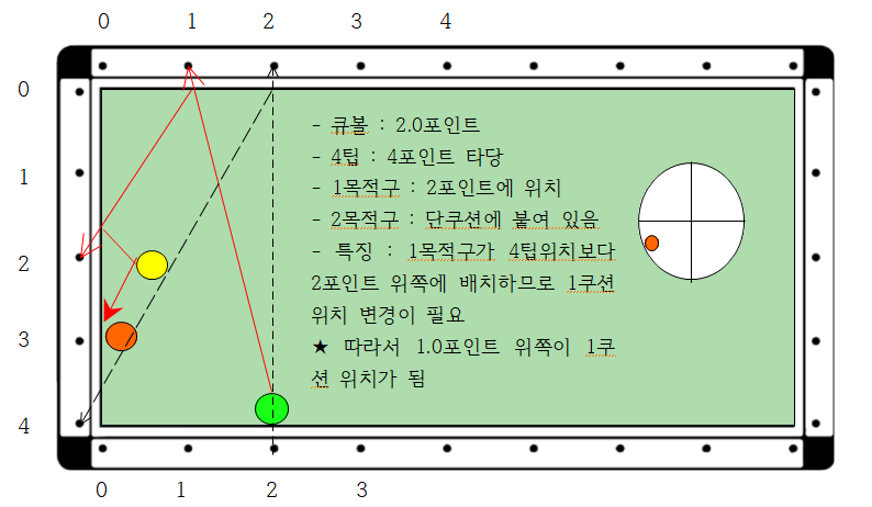 2. 검은점선에서 큐볼이 장쿠션 2.0포인트에 있으므로 4팁으로 보냈을 경우 단쿠션 0포인트로 간다는 원리인데 1목적구가 2포인트에 배치되어 있어 수정이 필요 합니다.