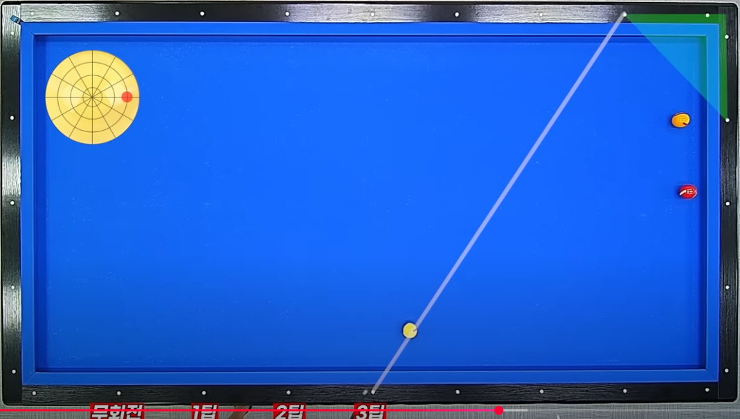 - 큐볼을 1쿠션 프레임포인트로 보냄