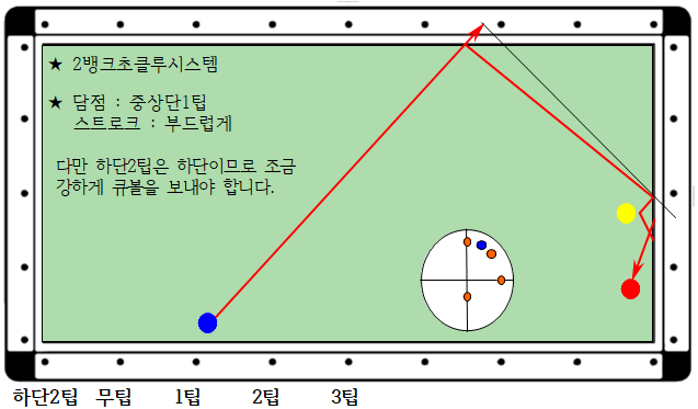 3) 무팁 위치에 큐볼이 있으므로 상단3팁으로 부드럽게 보내면 득점이 가능합니다