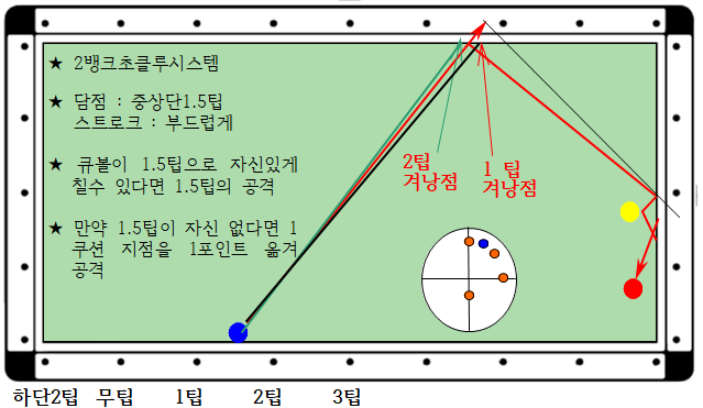 1) 큐볼이 1팁도 2팁도 아닌 중간에 배치되어 있을때 1.5팁으로 자신있게 큐볼을 보낼수 있다면 제일 좋은 방안입니다