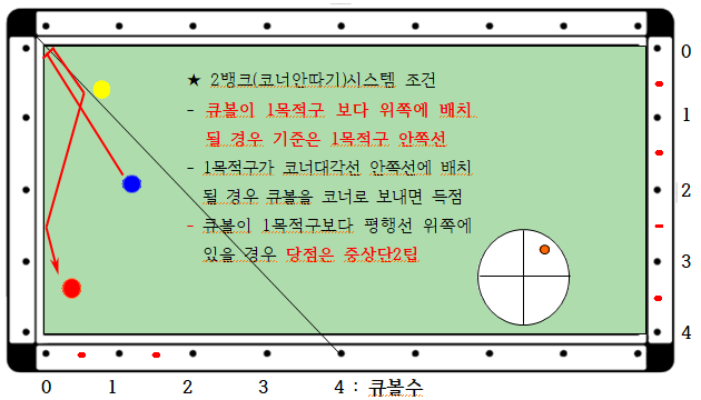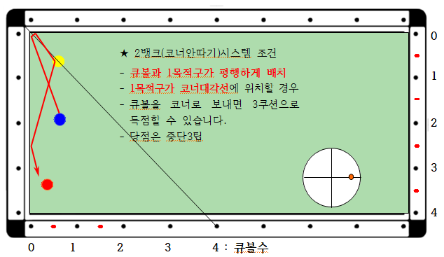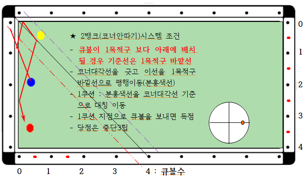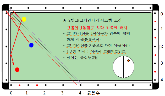 - 1쿠션 : 코너대각선 변동이 없으므로 코너 기점을 향하여 큐볼을 보내면 됨