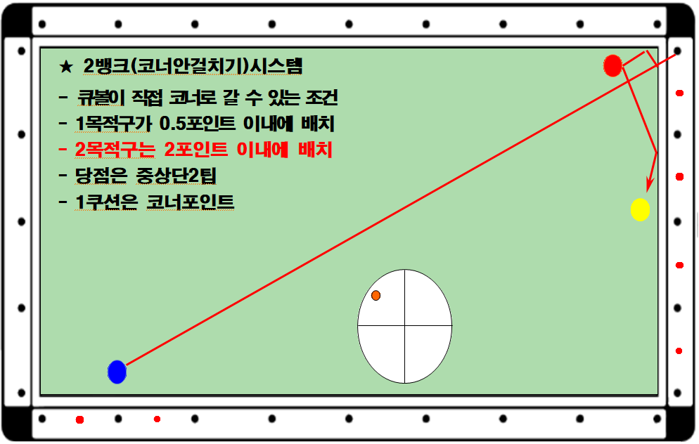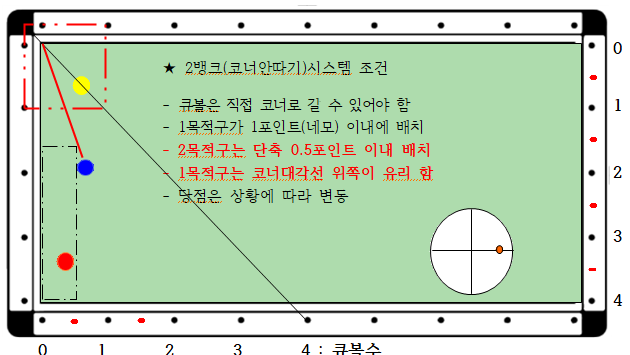 - 1목적구가 코너대각선 위쪽에 배치되므로 기준선은 1목적구 '안쪽라인'이 됨