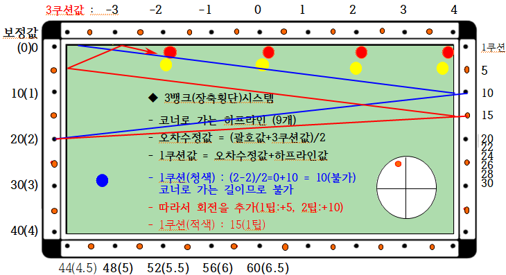 ◆ 여기 보이는 숫자, 즉 X축 숫자와 Y축 숫자는 보정값을 의미합니다. 그리고 보정갑이 0가 되면 득점이 불가하므로 회전을 고려하여 1쿠션을 결정하여야 합니다
