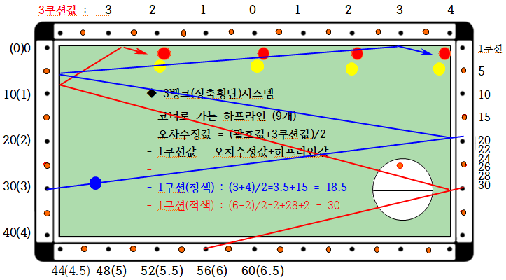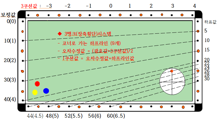 ◆ 그리고 이 시스템은 하프시스템이므로 무조건 출발지점의 1/2이 1쿠션이 되는데 목적구의 위치에 따라 하프값에 오차수정값을 추가하여 1쿠션으로 보내면 3쿠션으로 득점이 가능하다는 시스템입니다.