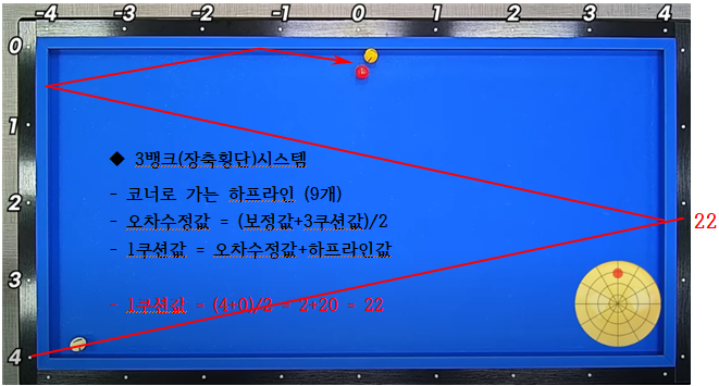 ◆ 결론적으로 1쿠션값은 : (4+0)/2 = 2+20 = 22가 됩니다, 무회전으로 출발지점 40에서 22로 보내면 득점이 가능합니다.
