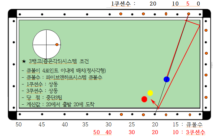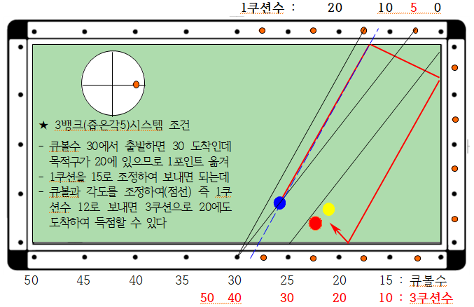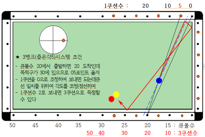 - 큐볼수 20에서 출발하면 20 도착인데 목적구가 30에 있다 즉 목적구가 1포인트(10) 앞쪽에 있어 1쿠션 지점 위치 조정이 필요 합니다. 따라서 1쿠션 지점을 5포인트에서 0 포인트로 겨낭점을 변경하야 합니다.