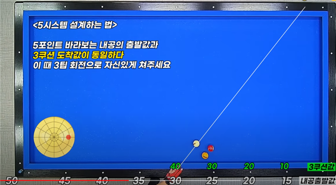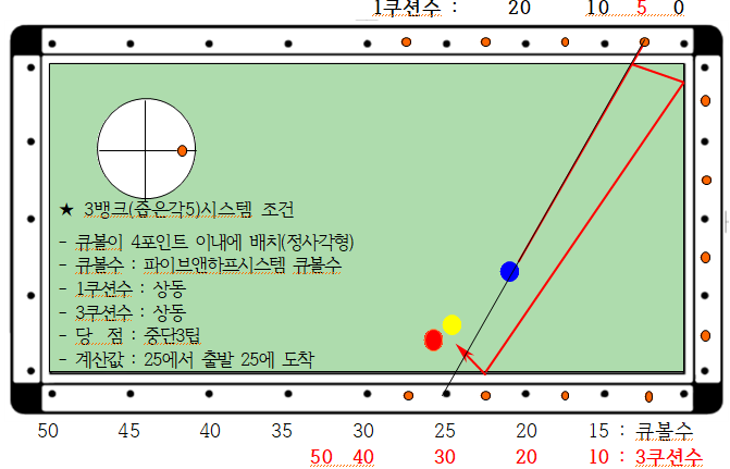 3뱅크시스템 중에서 파이브앤하프시스템을 이용하는 것인데 큐볼수 30(4포인트)에서 5에 보내면 3쿠션 30 으로 되돌아 온다는 이야기 입니다.