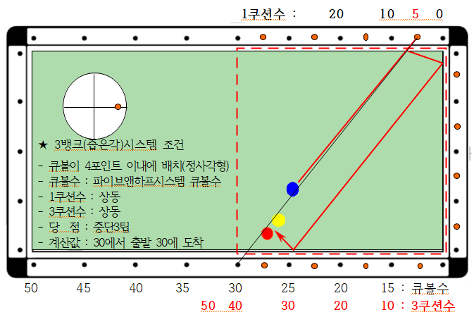 파이브앤하프시스템 큐볼수30에서 3쿠션 30으로 되돌아 오는데 엄격히 말하면 다같이 30 이지만 포인트는 다릅니다. 즉 큐볼수30은 4포인트 이고, 3쿠션 30은 3포인트 자리입니다. 착오 없어야 할 것입니다.